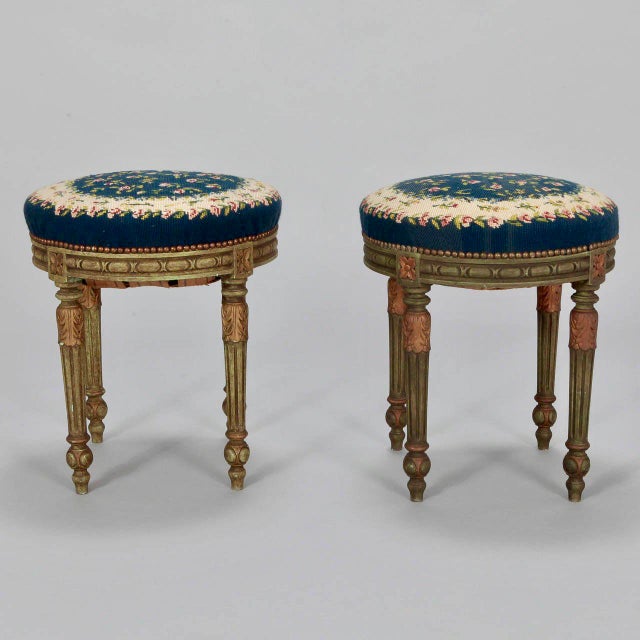 French Round Stools With Blue Needlework Upholstery A Pair