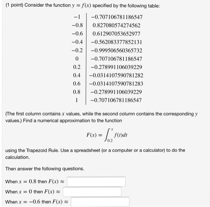Please enter a function starting point ending point and how many divisions with which you want to use simpsons rule to evaluate. Write the resulting value for in the column under in the table next to the value you used for in the calculation. Please enter a function starting point ending point and how many divisions with which you want to use trapezoidal rule to evaluate.