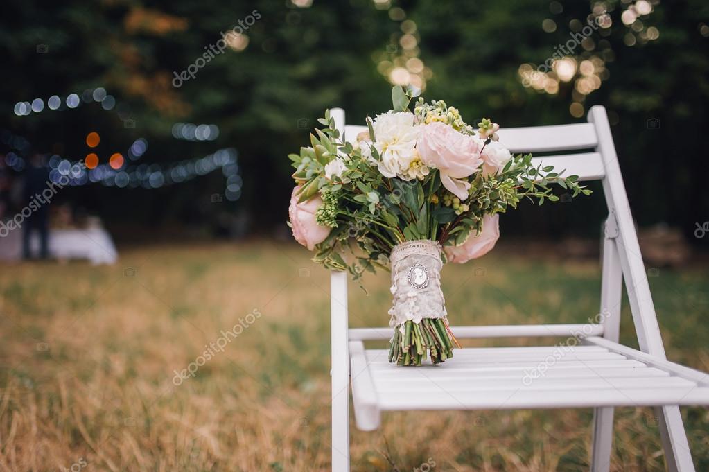 Wedding Bouquet Of Peonies Flowers And Greenery Standing On