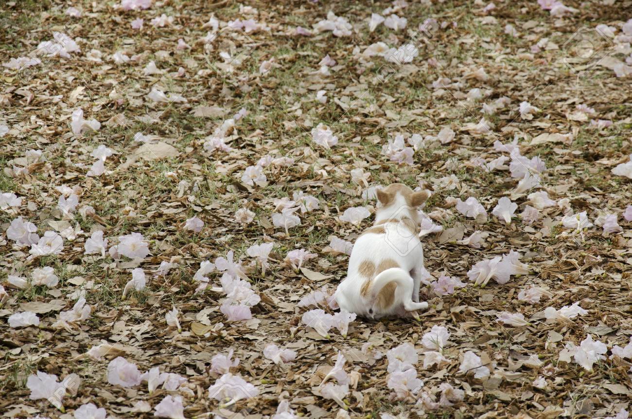 Little Dog Stool Or Poo On Ground With Pink Trumpet Tree In Garden