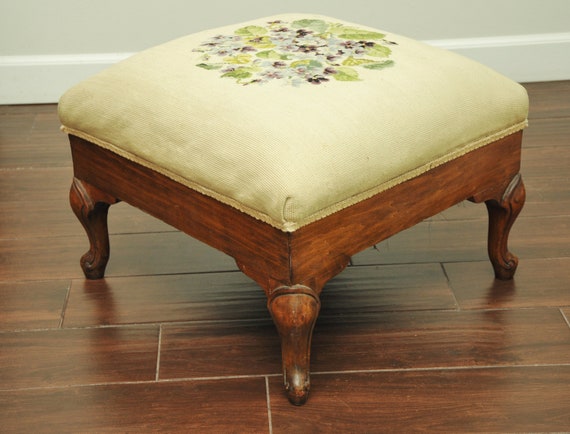 Needlepoint Footstool With Wood Legs Antique Wooden Stool Etsy