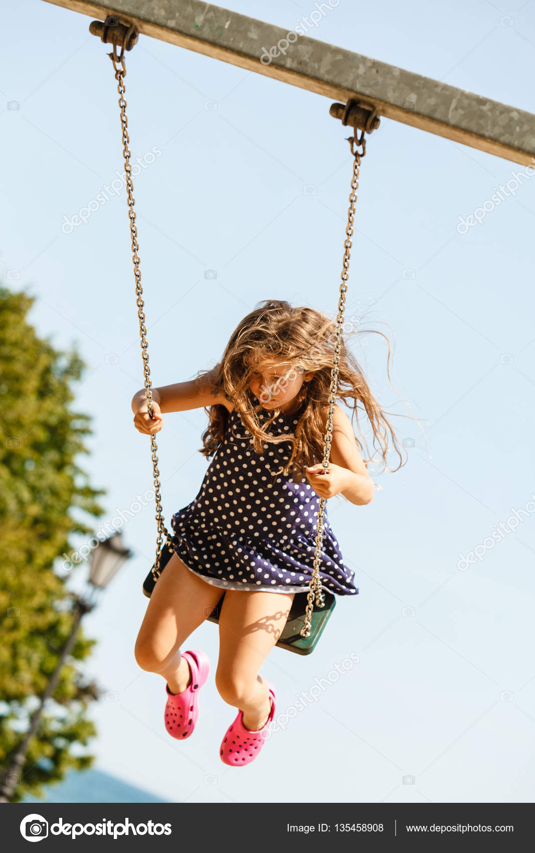 Girl Swinging On Swing Set Have Fun And Leisure Concept Long