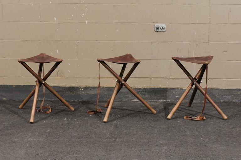 Three Tripod Stools Particularly Foldable Wood And Leather