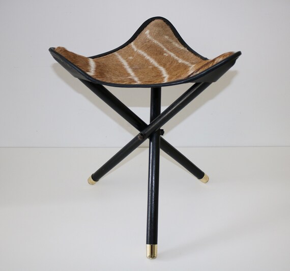 Mid Century Black Wood And Leather Backed Hide Tripod Folding Etsy