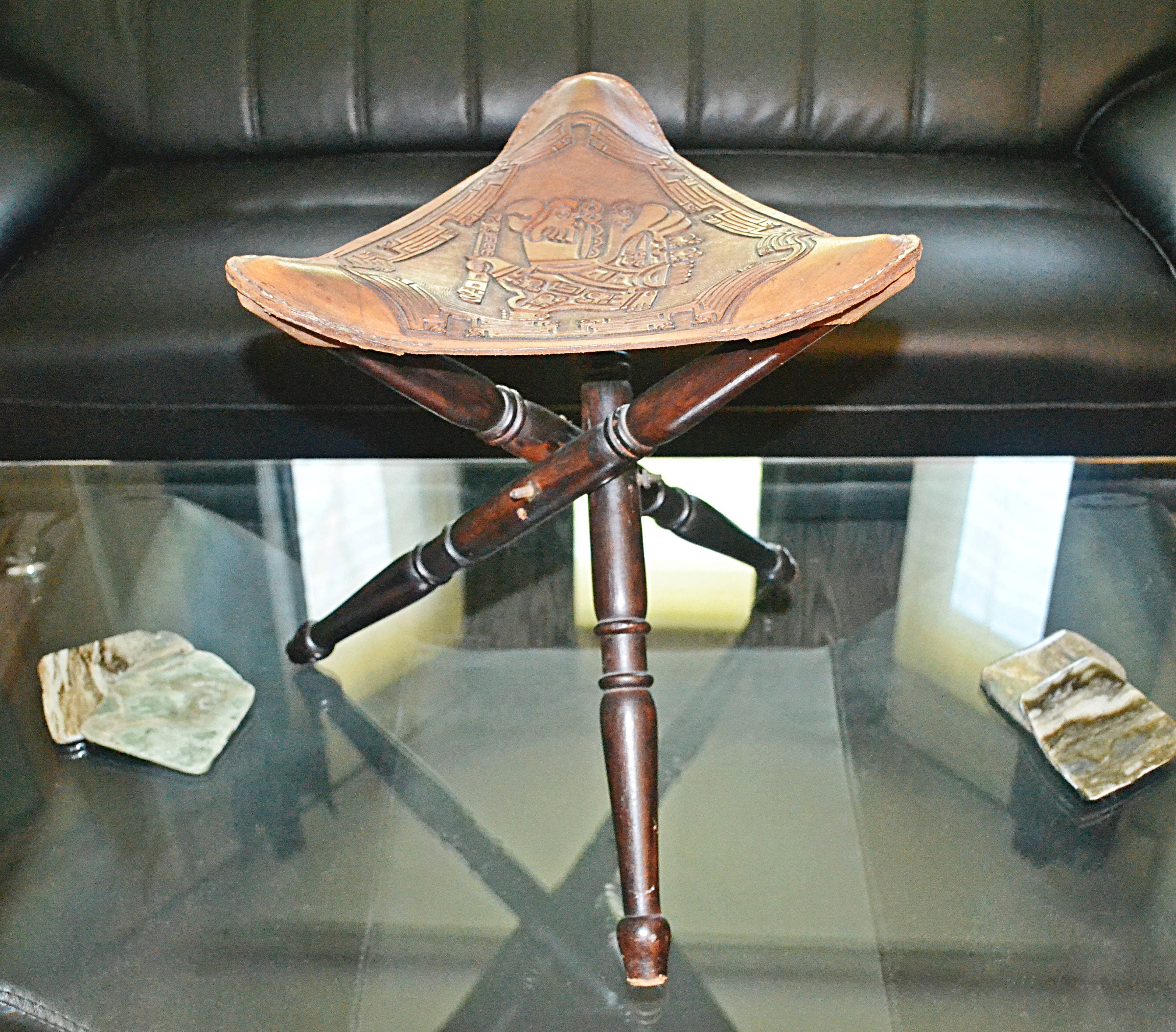 Vintage Leather Tripod Stool Stamped Hand Tooled Bamboo Fold Up