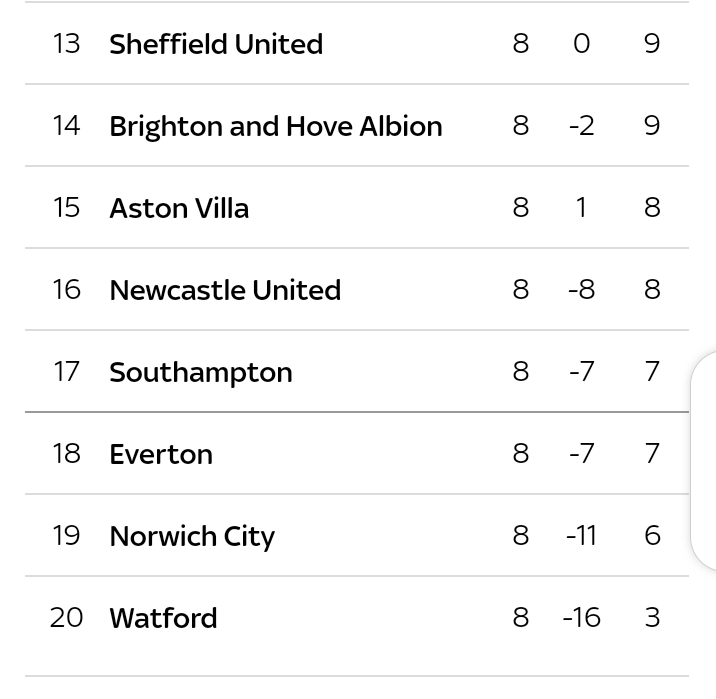 Epl Points Table Matchweek 8 English Premier League 2019 2020
