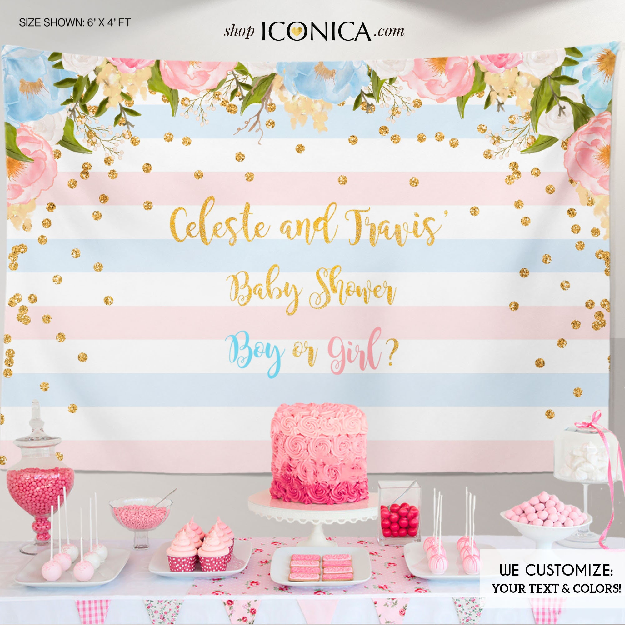 Floral Gender Reveal Baby Shower Backdrop Blue Or Pink Dessert