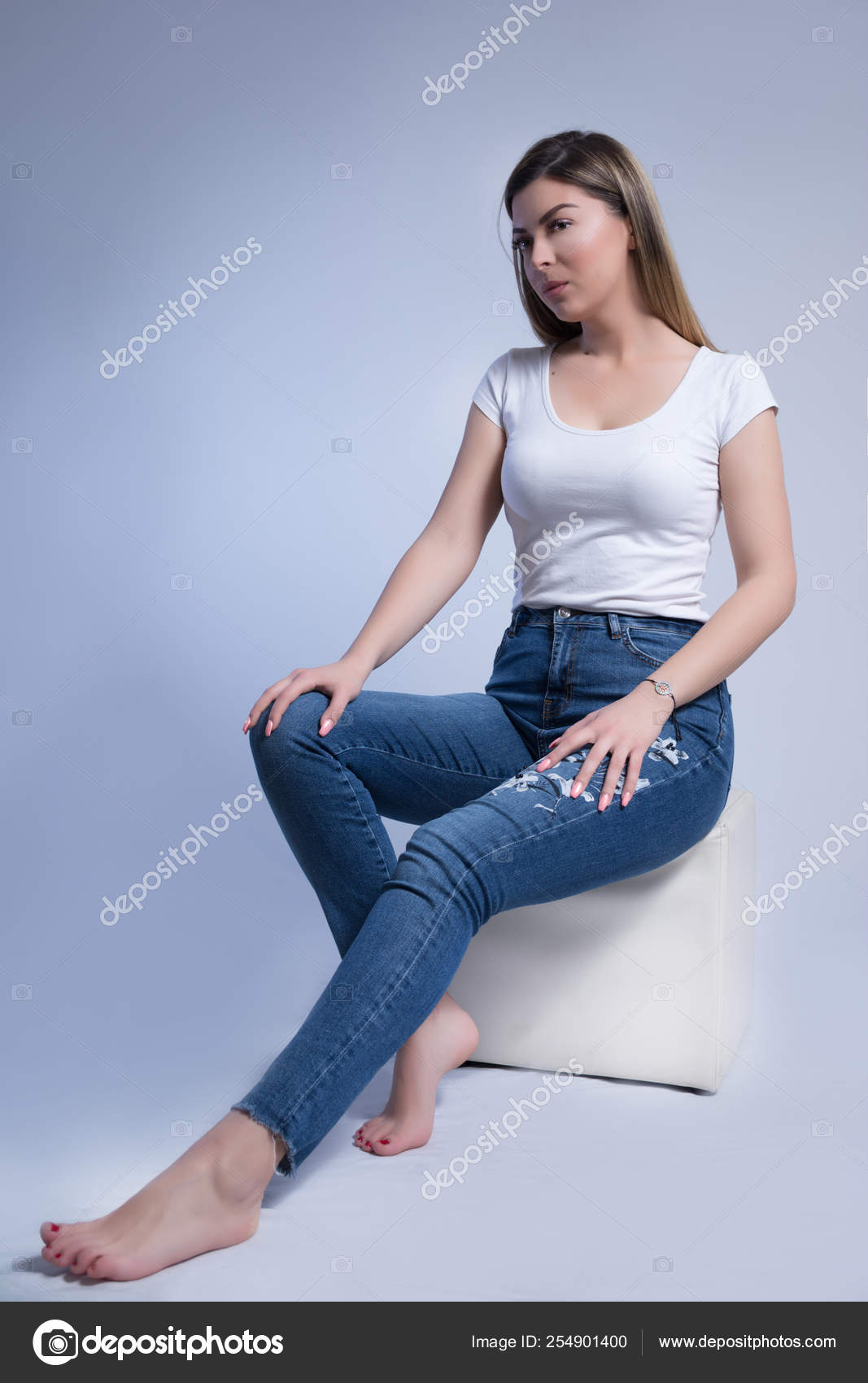 Cute Young Woman Blue Jeans Bare Feet Sitting White Cube Stock