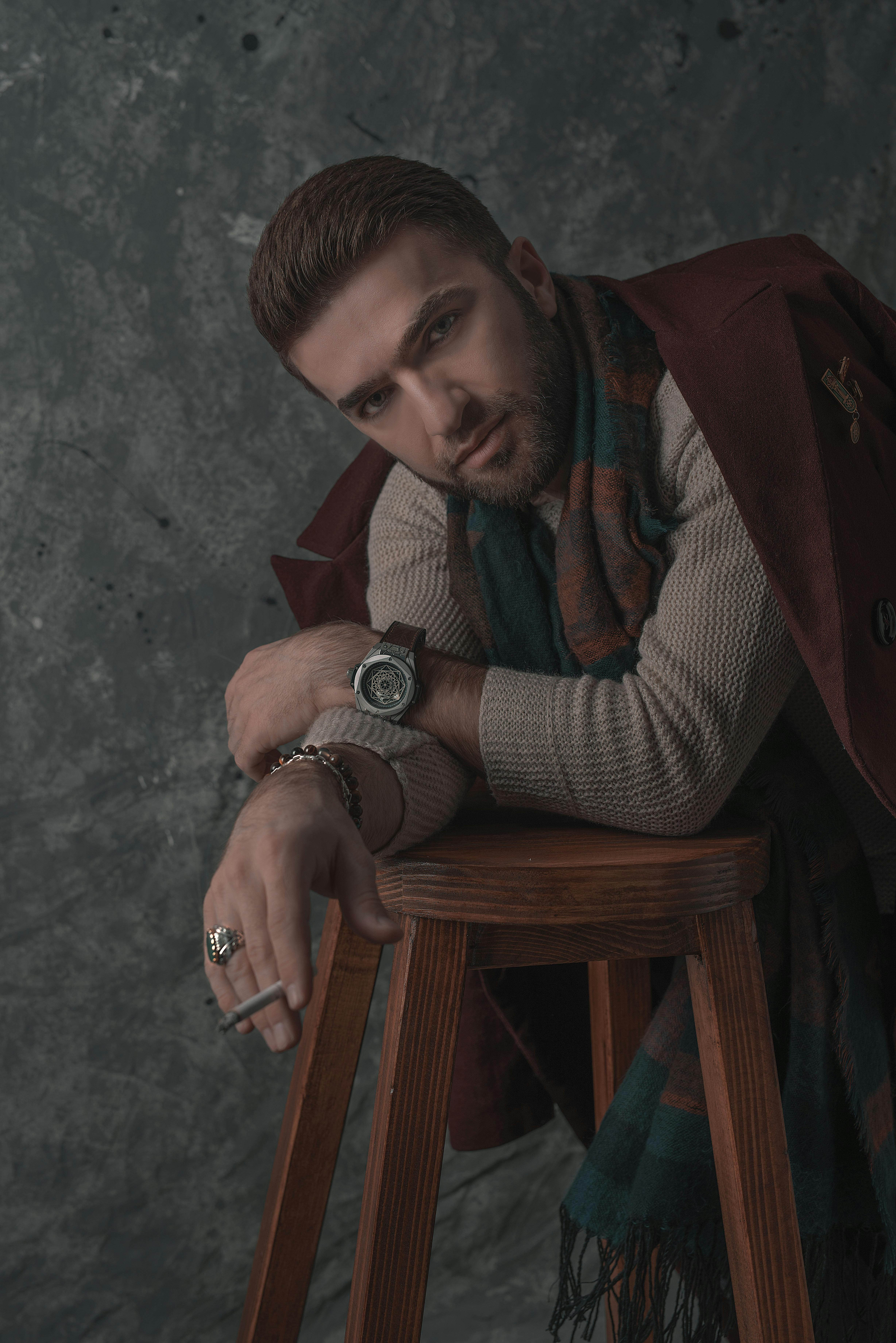 Photo Of Stylish Man Leaning On Stool While Smoking Free Stock Photo