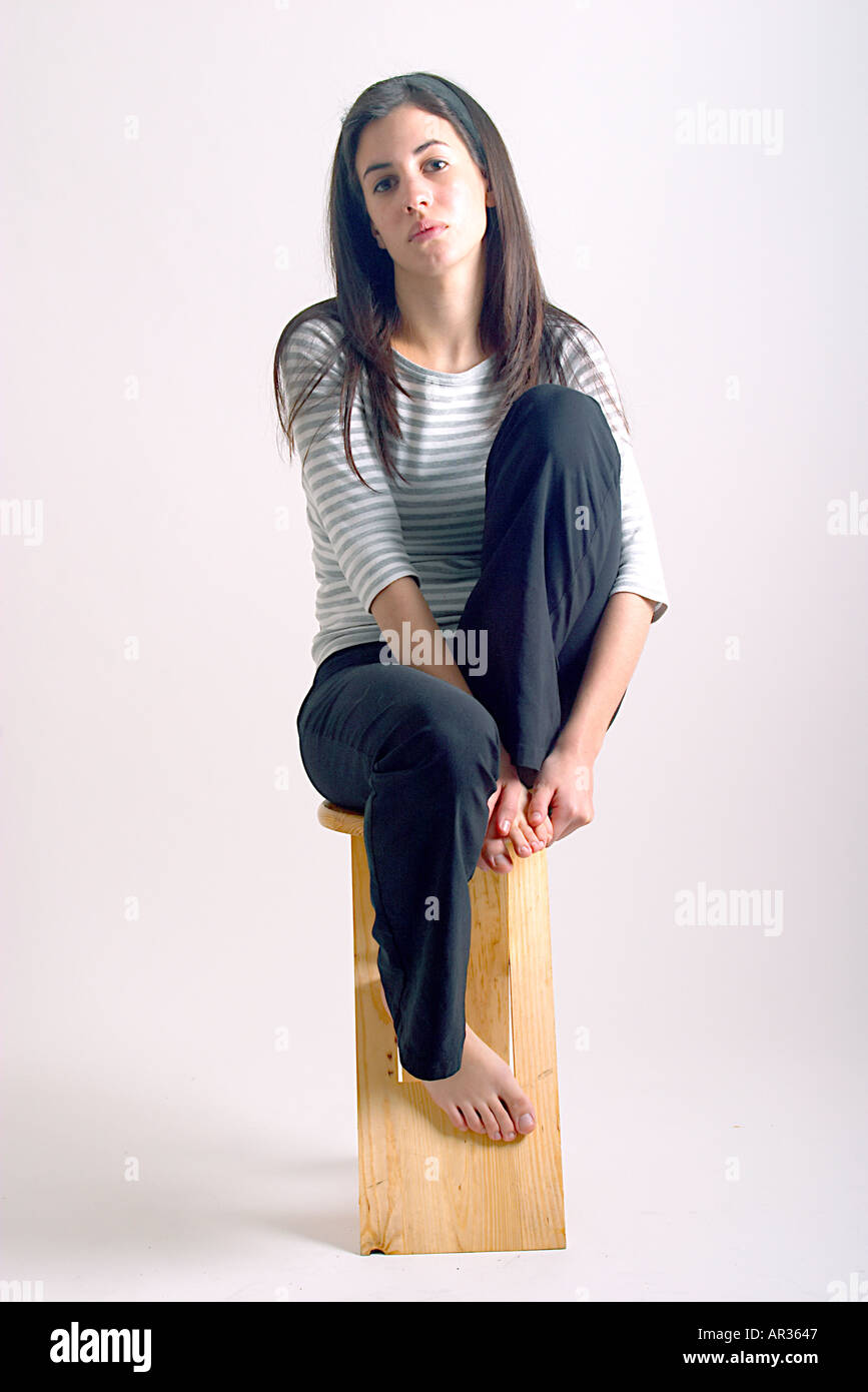 Young Black Haired Barefoot Woman Sitting On A Stool With Left Leg