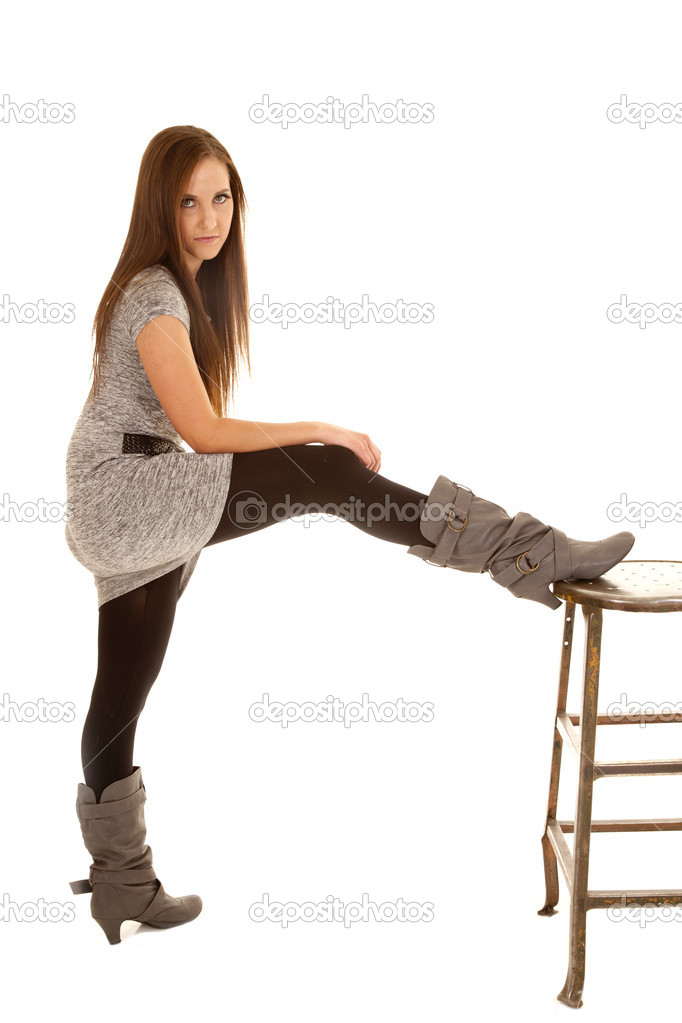 A Woman Standing By A Stool With Her Foot Kicked Up In The Air