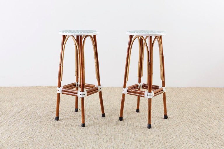 Set Of Three Maison Gatti Rattan French Bistro Barstools For Sale