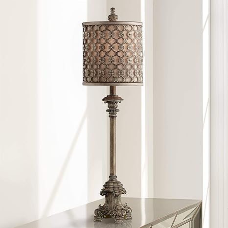 French Buffet Table Lamp Beige Scroll Metal Lattice Candlestick