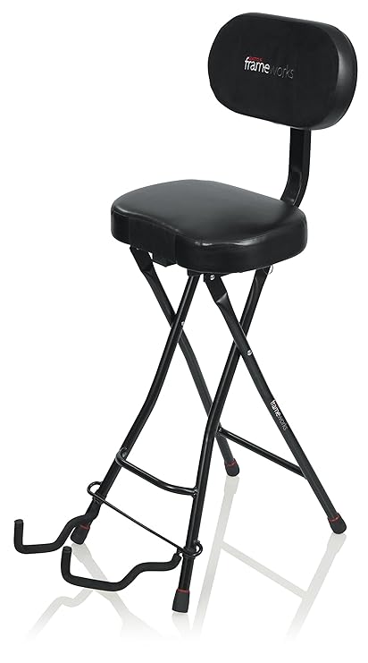 A guitar stool is a specially designed chair used by guitar players. How many legendary artists started their careers in local bars sitting on a simple wooden stool on open mic night. The only issue i can see is when the guitar stand is folded up not ready for use out of the way it reduces the area of the foot rest to only one foot comfortably.