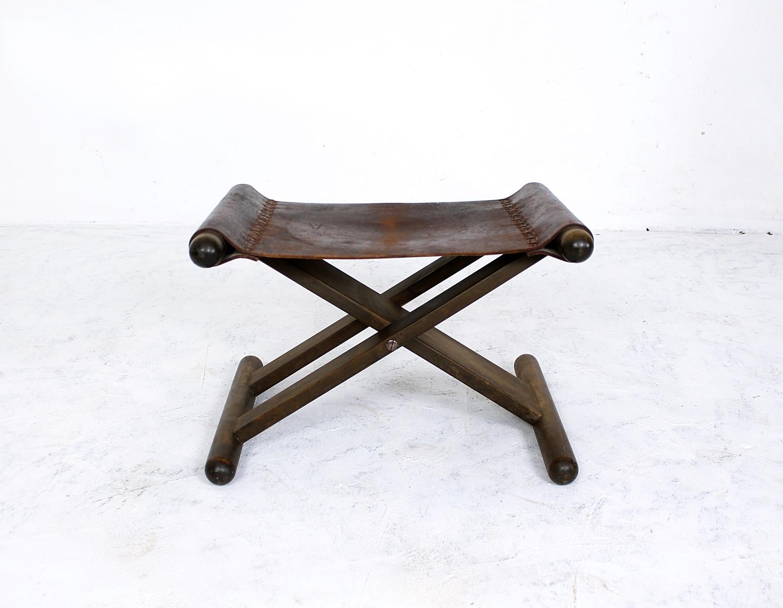 Camel Saddle Stool With Leather Cushion And Folding Legs 1960s