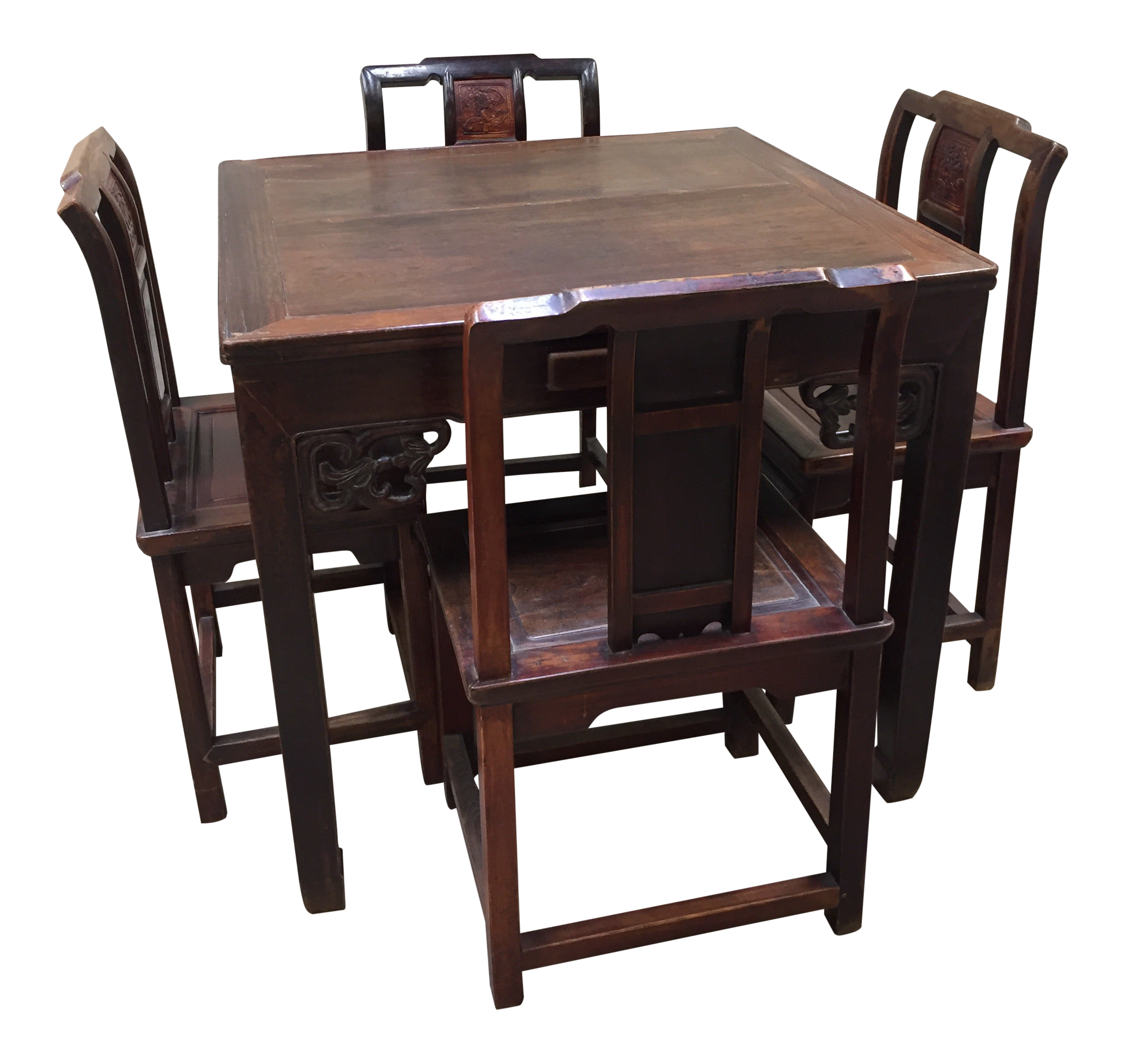 Late 19th Century Antique Chinese Gaming Table Chairs 5 Pieces