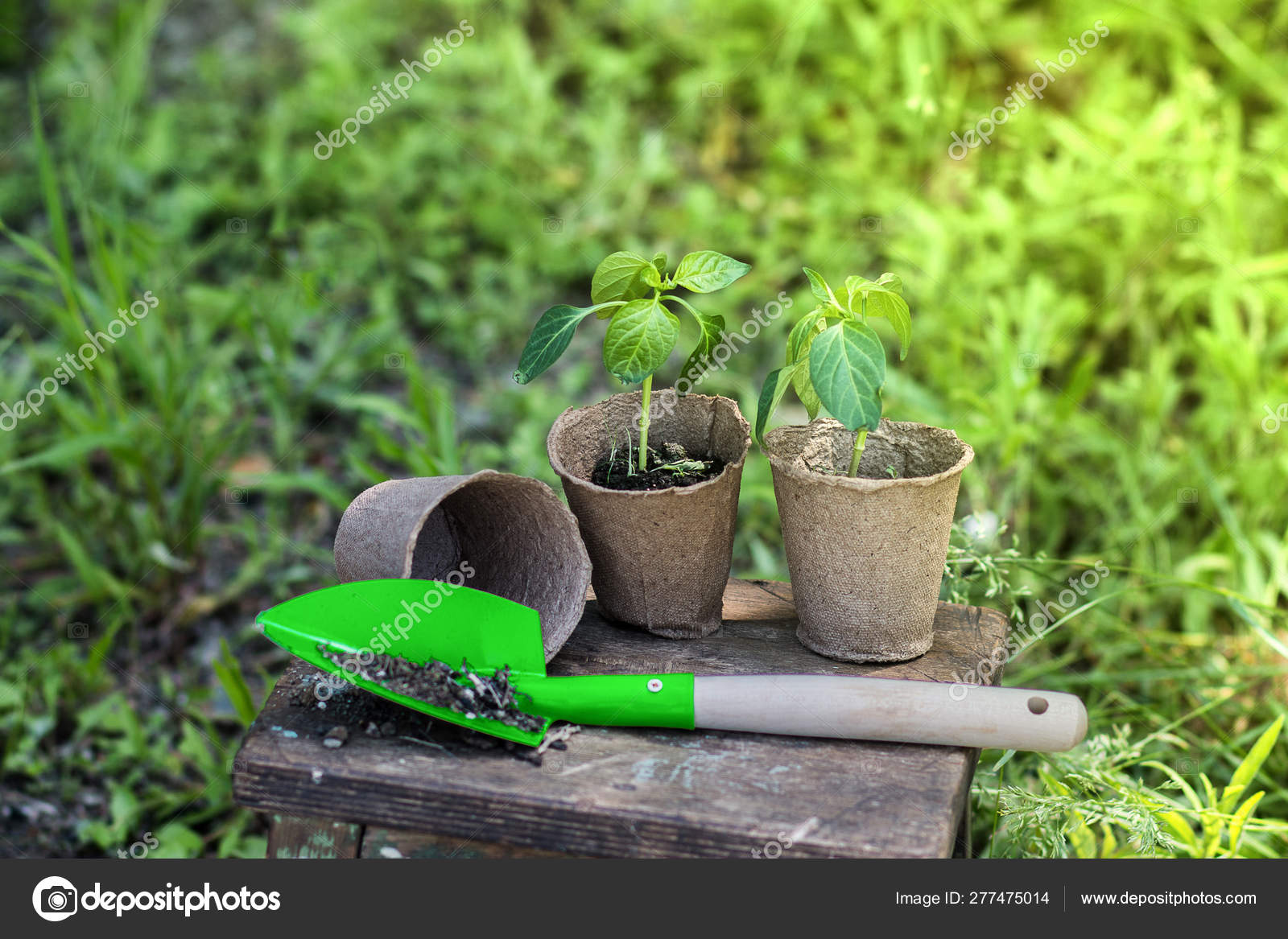 Seedling Of Pepper And Green Shovel On A Wooden Stool In A Garden