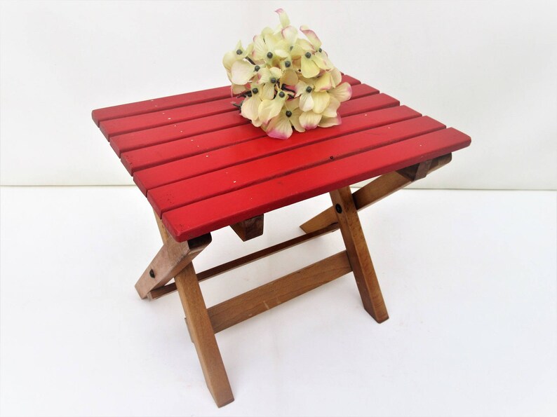Vintage Red Wood Riser Primitive Stool Bench Slat Top Folds Flat