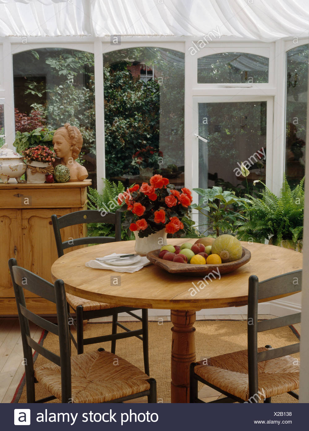 Bowl Of Fruit On Pine Table With Pine Chairs In Cottage Dining