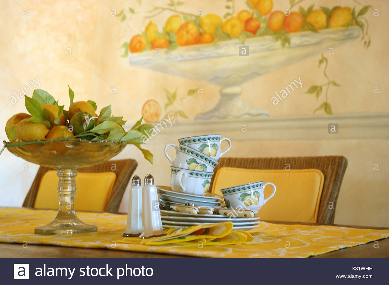 Cups Saucers And Fruit Bowl On Dining Table Stock Photo