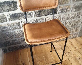 Reclaimed Metal And Genuine Brown Leather Bar Stool