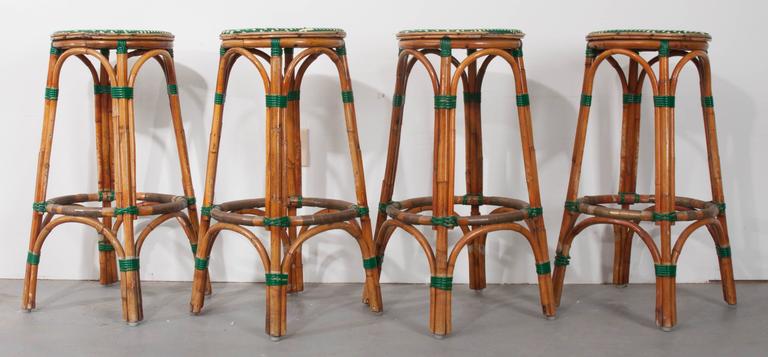 Set Of Three Maison Gatti Rattan French Bistro Barstools For Sale
