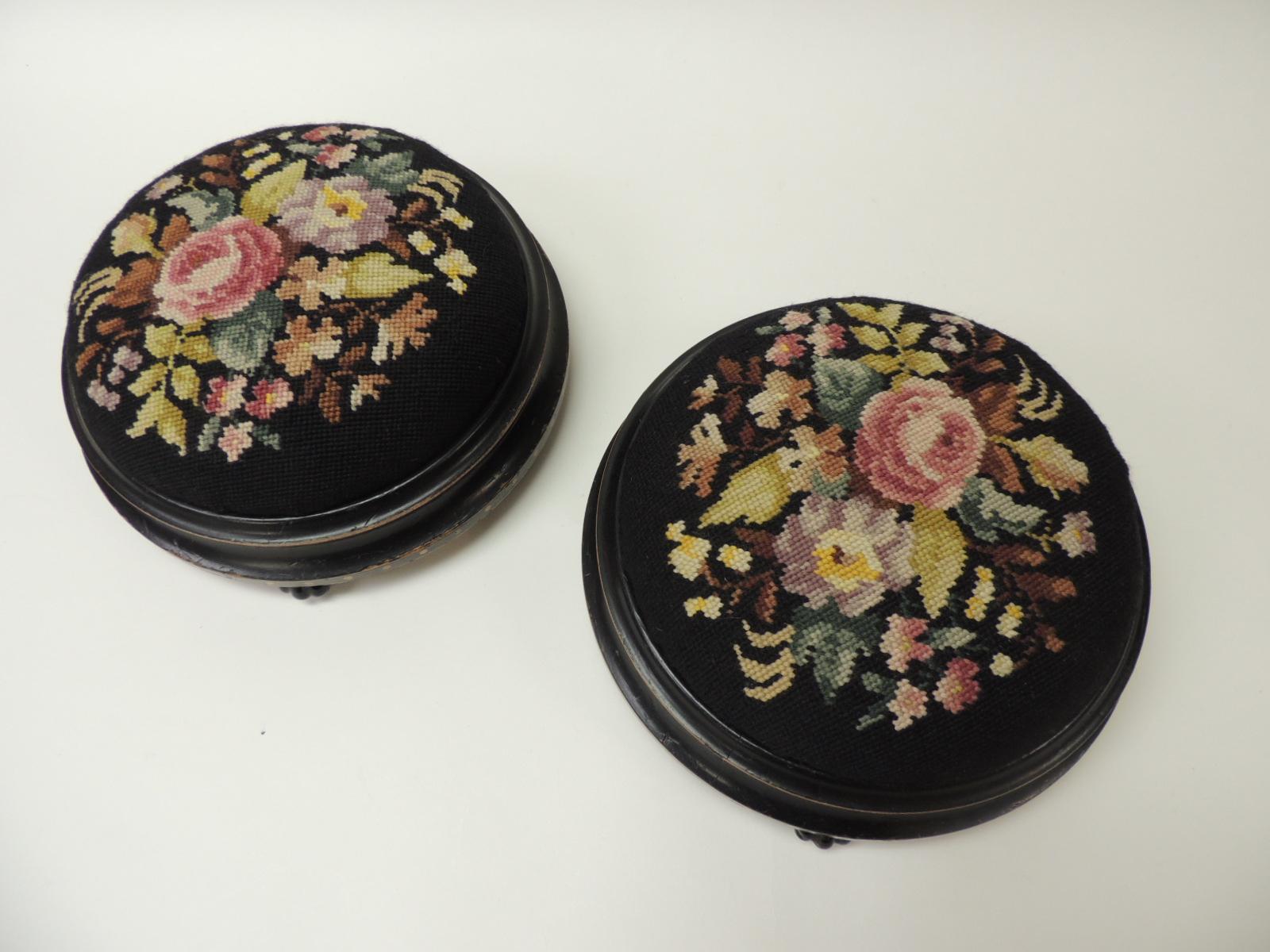 Pair Of 19th Century Floral Tapestry English Round Foot Stools At